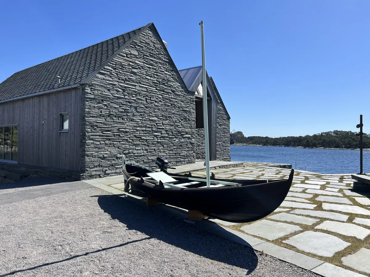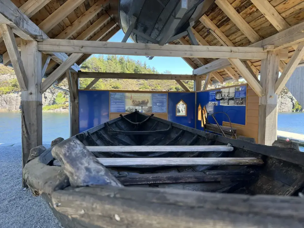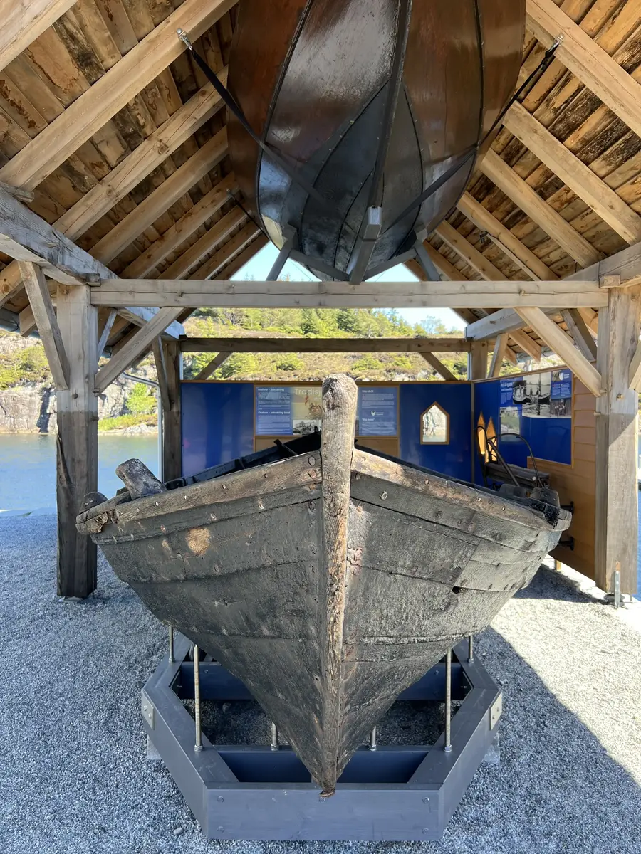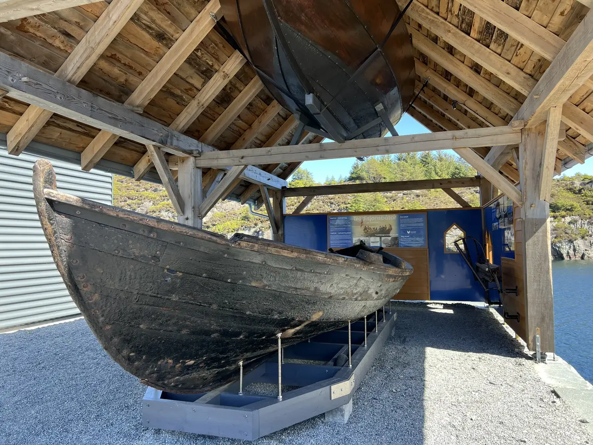 Under grindverksbygget på kaien finn du Storabåten med notspel og Seifisteinen. Seifisteinen er båten som heng oppunder taket.