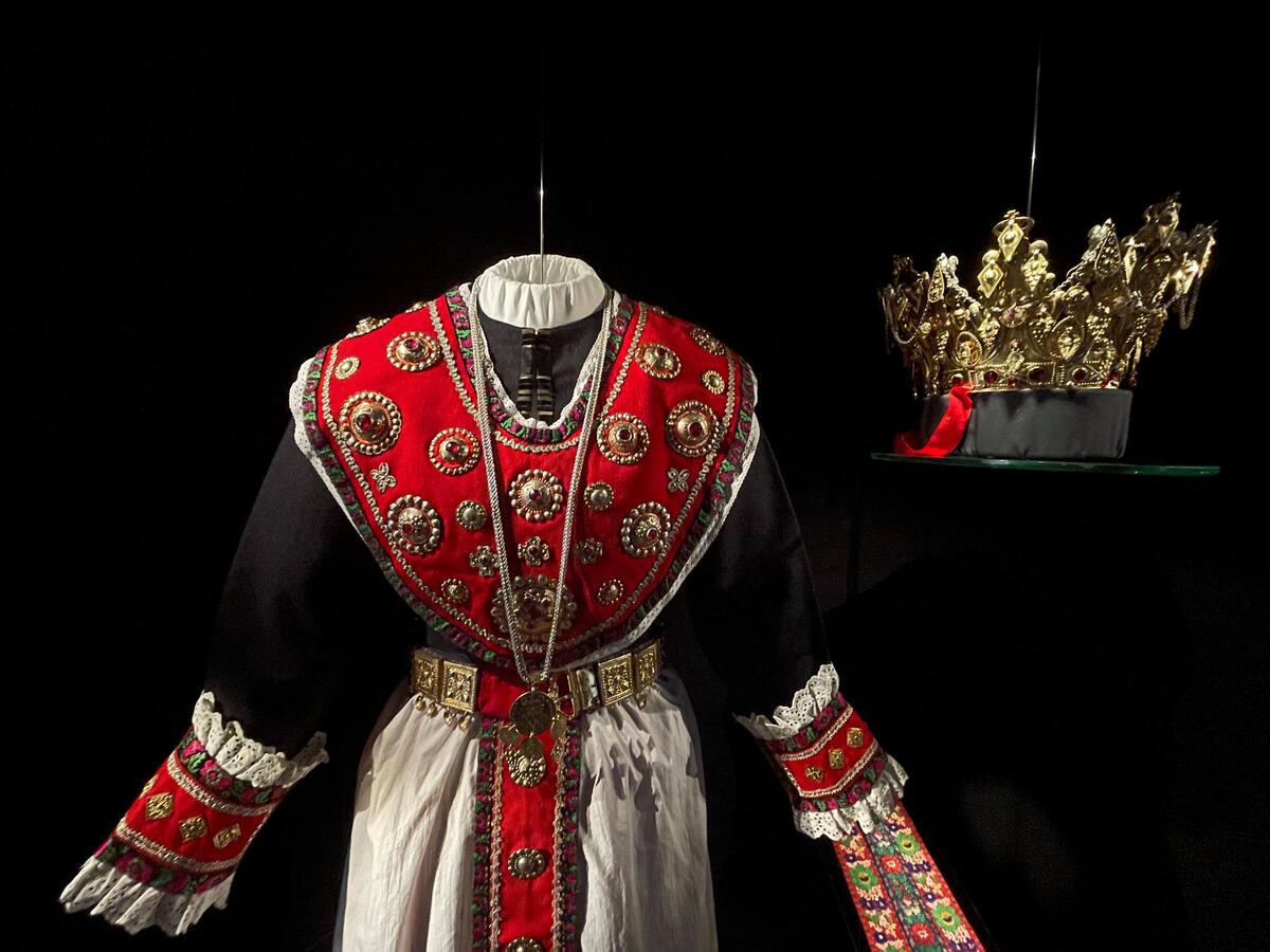I tillegg til kronebruredrakten er gjestane sine draktar representert, i tillegg til eit utval bringeklutar frå samlinga vår.